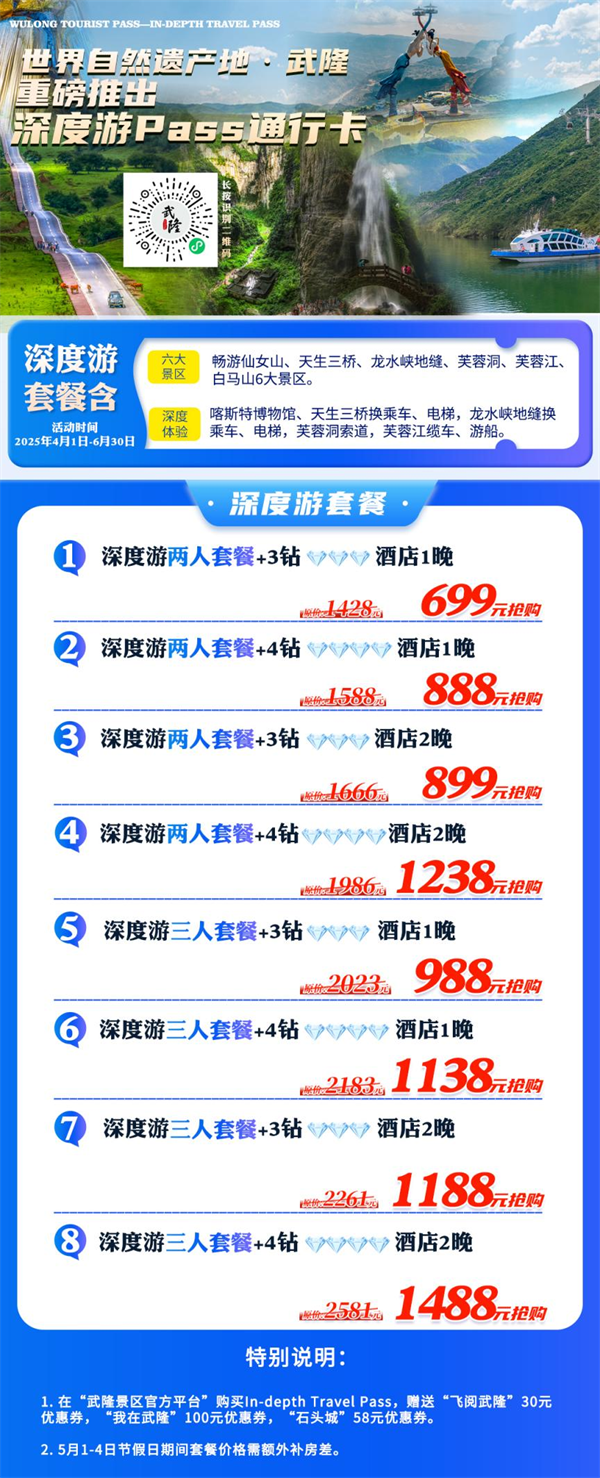 4月1日—6月30日,家庭出游、好友组团闭眼入!低至1折的深度游卡,把仙女山、天生三桥、龙水峡地缝、芙蓉洞、芙蓉江、白马山6大核心景区全打包!换乘车、电梯、索道、缆车、游船全程护航,搭配3钻、4钻酒店套餐,深度玩转武隆不用操心任何细节,懒人福音直接拉满。