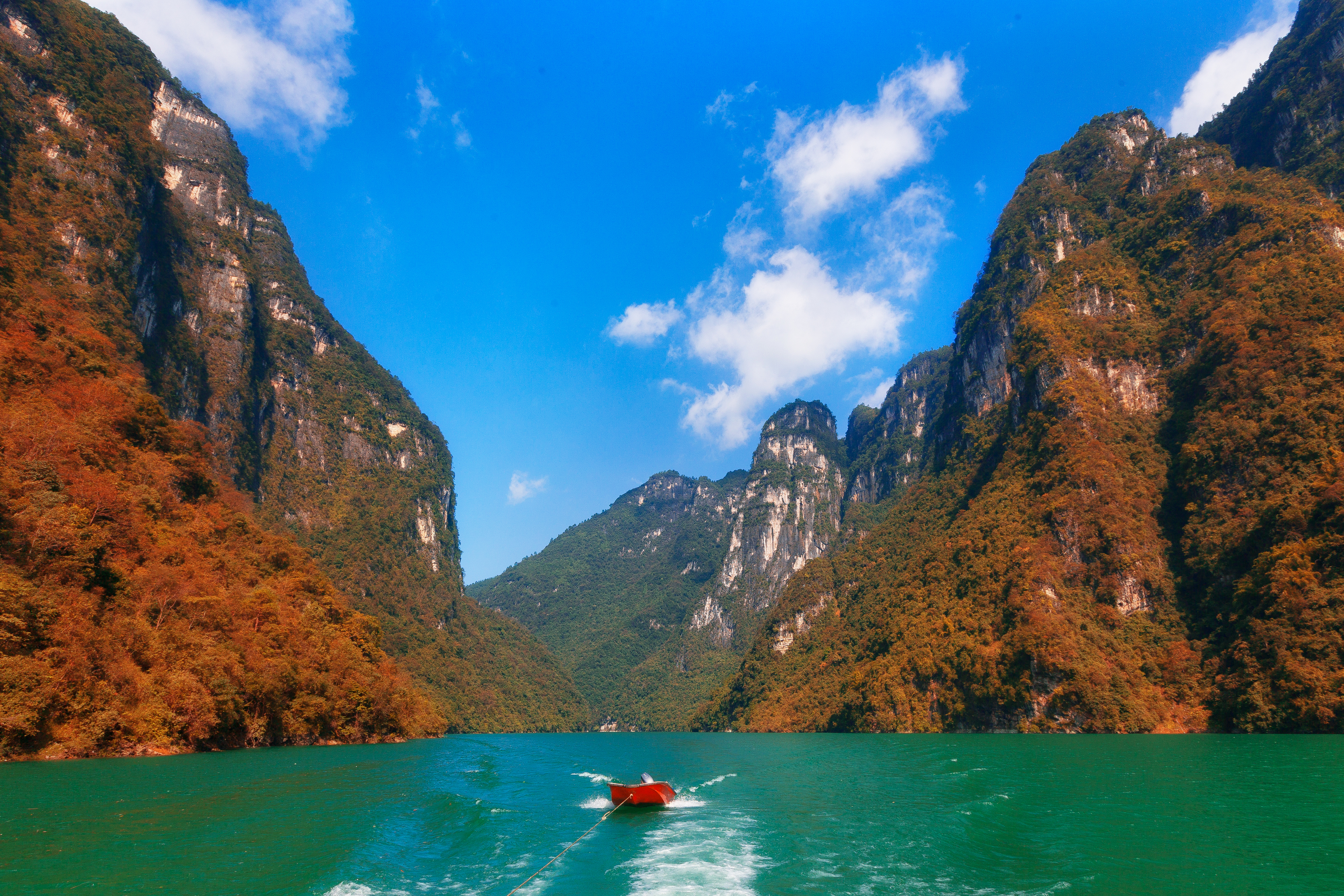 乘一叶画舫,慢行山水间。澄澈江水与两岸斑斓彩林,构成一幅流动的画卷。船行江上,看树影倒映,寻岩壁红叶,江风带来林木清香,只想让时间在此刻永远停留。