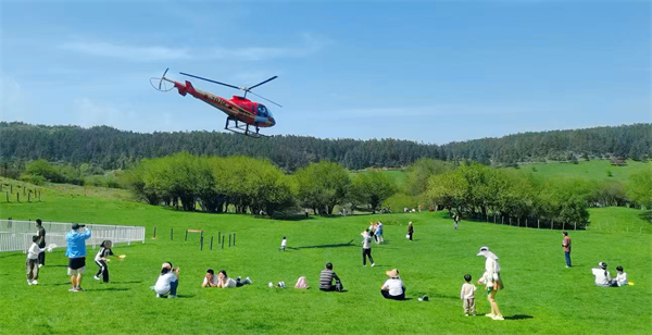 仙女山大草原内直升机呼啸而上,螺旋桨搅碎云絮,将草原上万千游客的笑靥织进天幕。游客们举起手机拍摄,闪光灯此起彼伏。