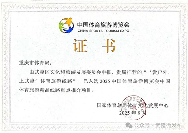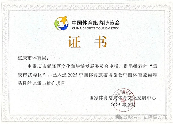 9月13日,2025中国体育文化博览会暨中国体育旅游博览会核心活动——中国体育旅游精品项目推介在苏州隆重举行。武隆区一举摘得两项重要荣誉:“重庆市武隆区”荣膺“2025中国体育旅游目的地”重点推介,“爱户外上武隆”体育旅游线路获评“2025中国体育旅游精品线路”重点推介。这标志着武隆成为近两年重庆乃至全国收获体育旅游国家级荣誉最丰硕的区县之一。