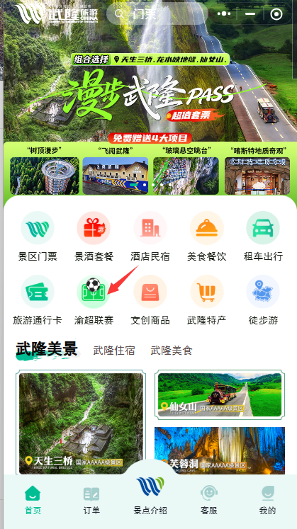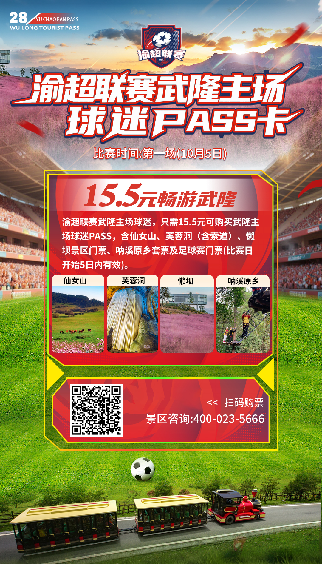 针对前来武隆主场观赛的球迷,推出包含球赛门票的“渝超联赛PASS卡”,只需花15.5元便可观看武隆主场球赛,并在比赛结束后5天内畅游武隆仙女山、芙蓉洞、懒坝、吶溪原乡四大景区。