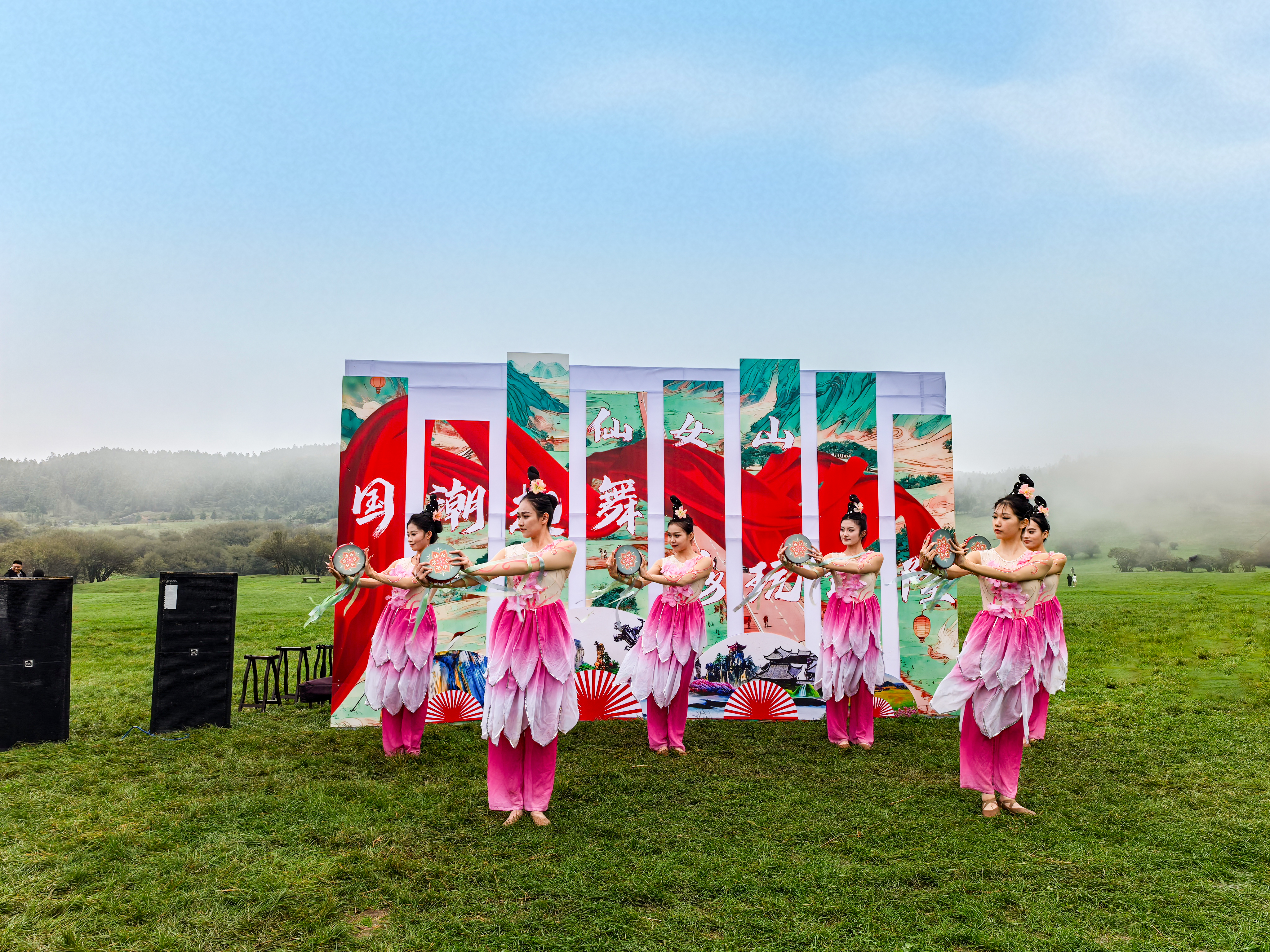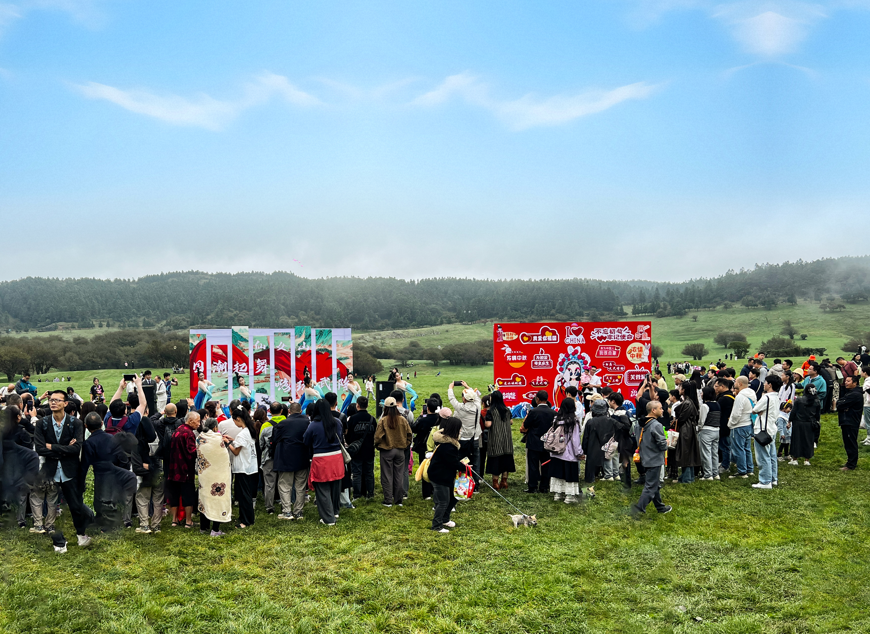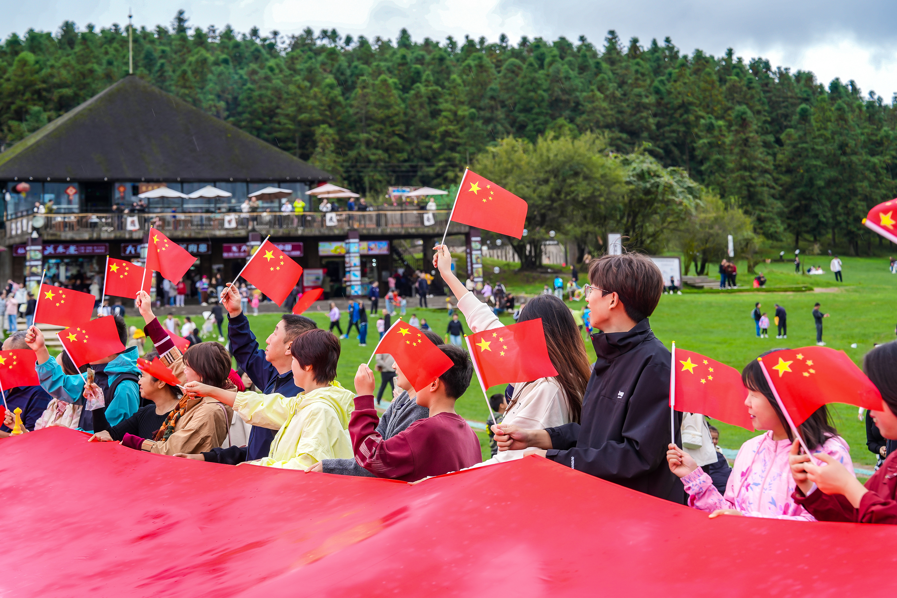 五大国潮活动成 “人气磁场”:仙女山景区,《丽人行》舞者刚谢幕,工作人员便摆出装满小国旗、“爱心” 贴纸、国旗发夹的礼品桌,孩子们围拢领取,成年人举旗与舞者同框,红旗下,草甸金黄与舞者朱红裙摆相映成趣。