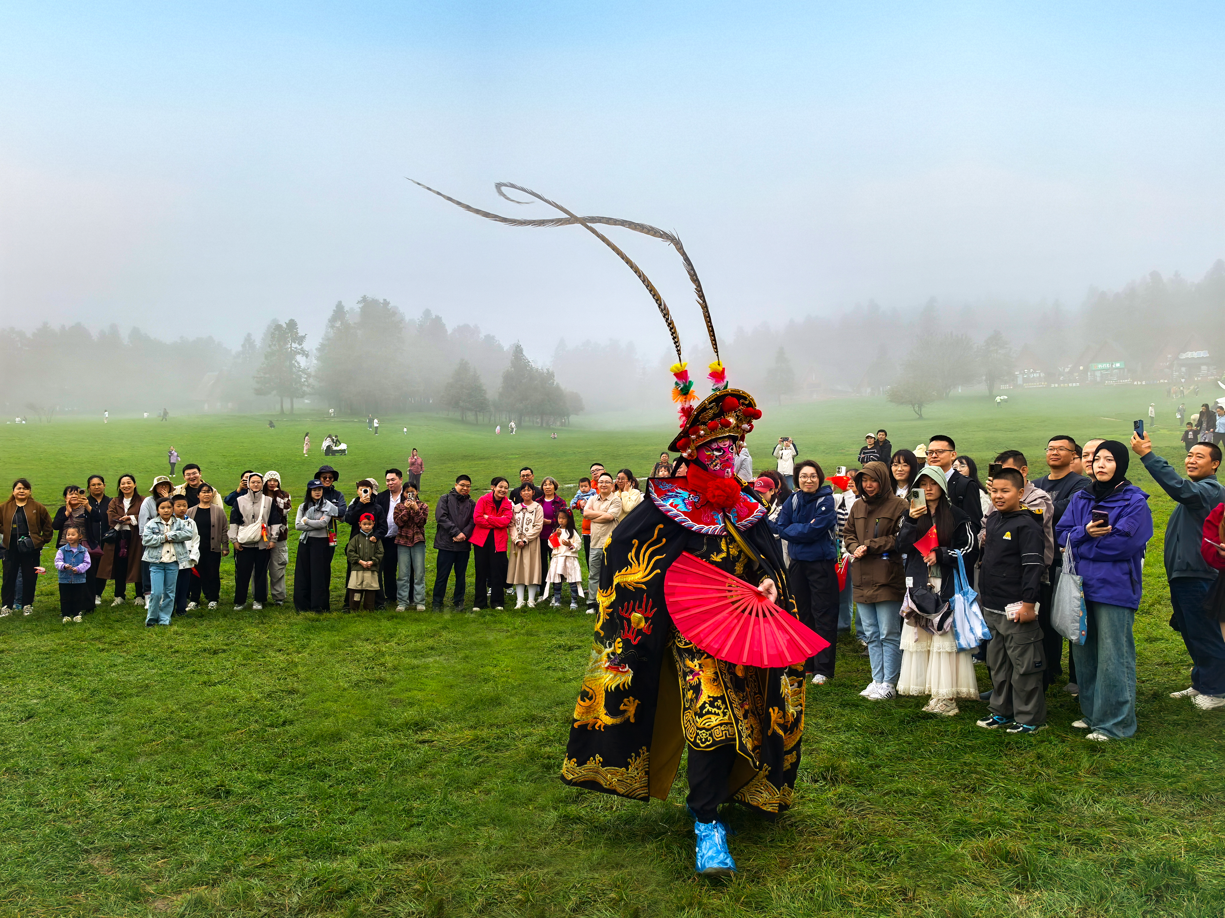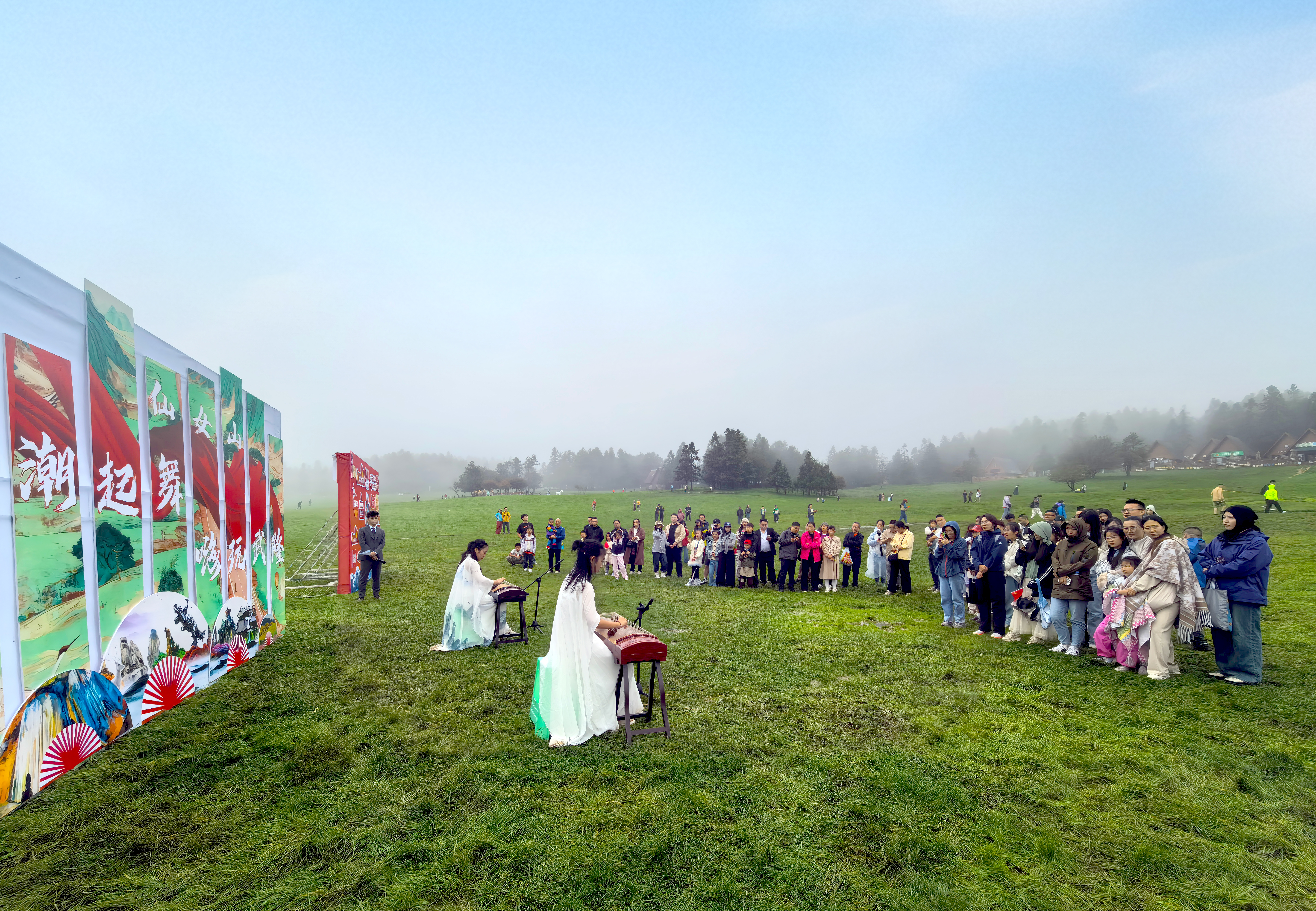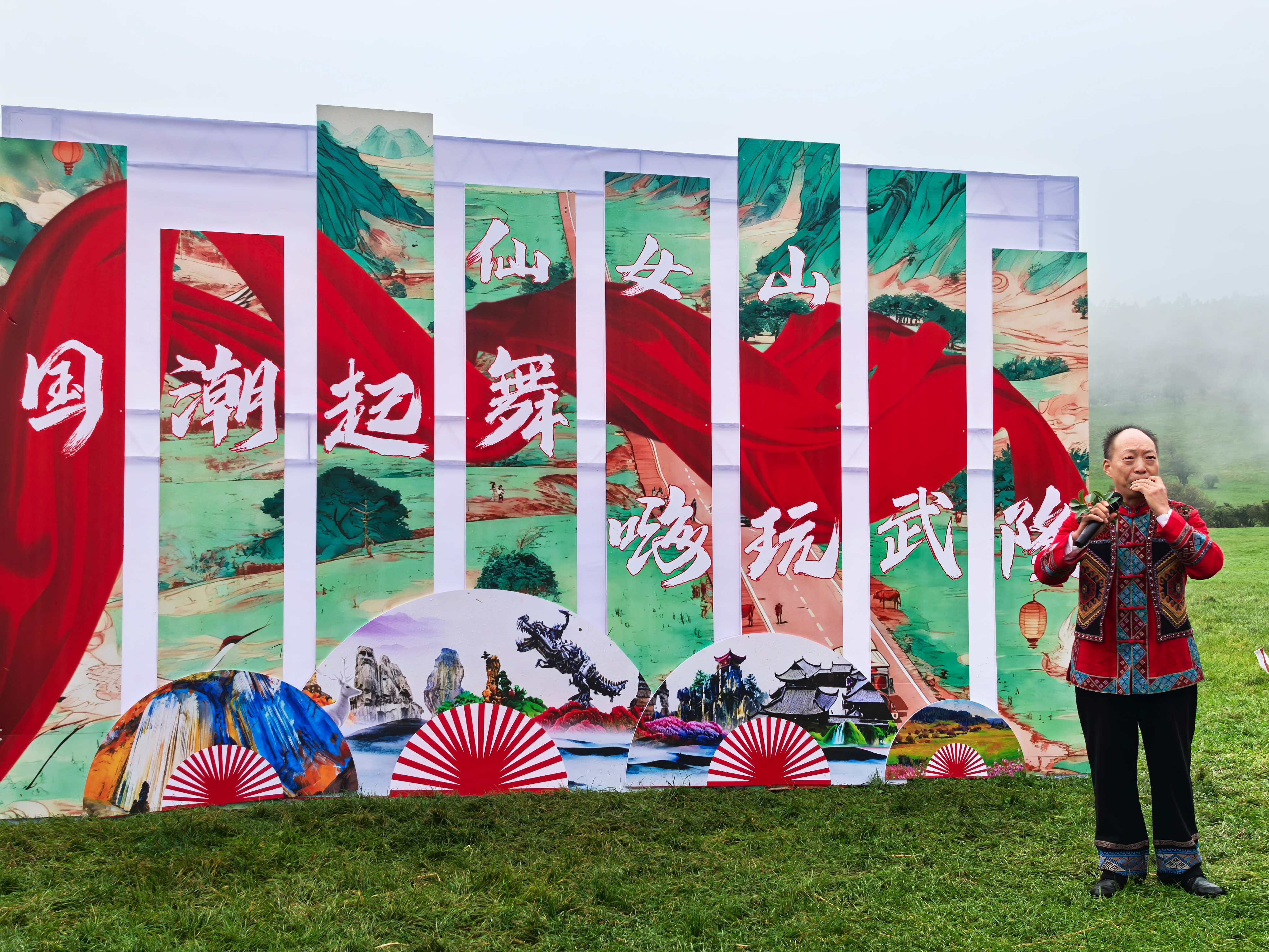 五大国潮活动成 “人气磁场”:仙女山景区,《丽人行》舞者刚谢幕,工作人员便摆出装满小国旗、“爱心” 贴纸、国旗发夹的礼品桌,孩子们围拢领取,成年人举旗与舞者同框,红旗下,草甸金黄与舞者朱红裙摆相映成趣。