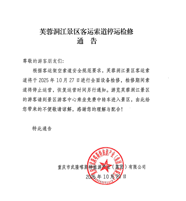 文章来源: 重庆市武隆喀斯特旅游产业(集团)有限公司 作者:匿名 2025-10-21 15:30:29摘要: 芙蓉洞江景区客运索道将于2025年10月27日进行全面设备检修,检修期间索道将停止运营,恢复运营时间另行通知。【免责声明】:本平台发布及转载文章仅作同行交流学习,部分数据来源于网络,未经证实,并非商业用途,也并非针对具体单位和个人,请勿对号入座,部分内容及图片来源于网络,版权归原作者所有,若未能找到作者和原始出处还望谅解。如有版权疑问,或者文章内容出现侵权行为,请联系本官网后台,我们会第一时间及时进行删除处理,谢谢。