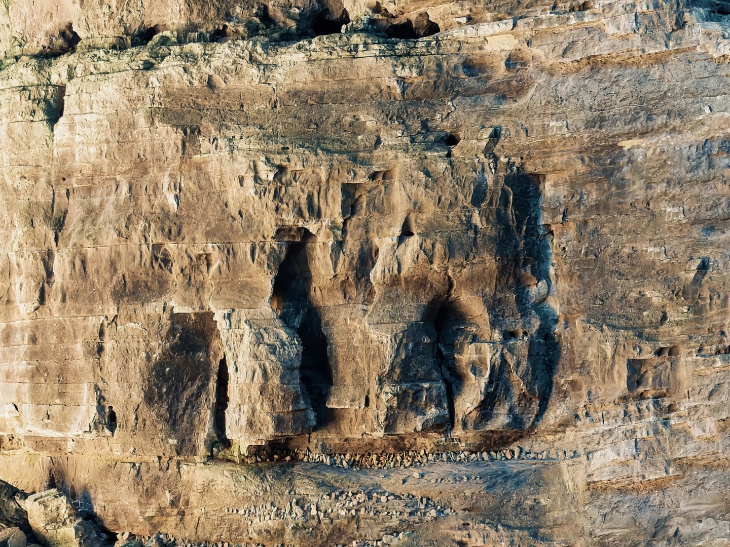 3.在身边寻找三颗形态各异的小石,郑重叠放于稳固的岩壁凹陷处。