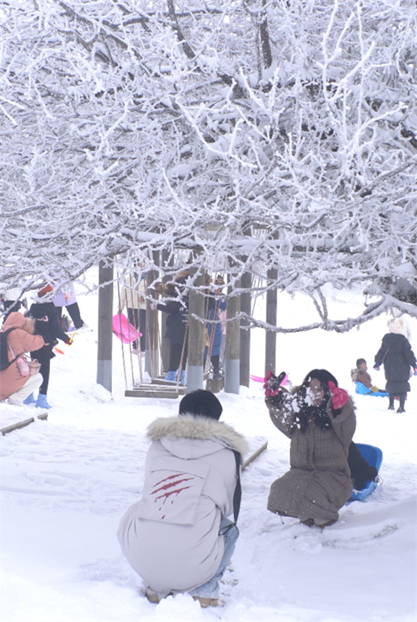 雪景中的仙女山宛如仙境,吸引了众多游客前来观赏游玩。游客们纷纷陶醉在这银装素裹的美景中,对景区良好的交通秩序和贴心的服务赞不绝口。一位来自四川的游客兴奋地说:“元旦假期选择来仙女山真是太明智了!这里的雪景太美了,而且景区的交通和服务都这么好,让人感觉特别舒心。这姜茶喝下去,浑身都暖和了,真的非常感谢工作人员!”