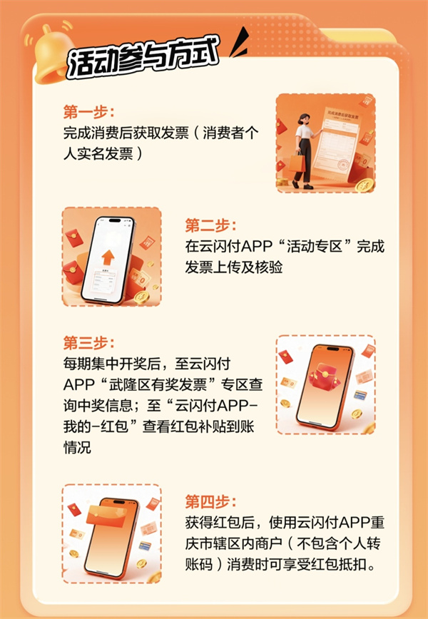 消费满100元并开具实名制普通发票,通过云闪付APP上传即可参与。奖金自动发放至云闪付账户,在武隆全区支持云闪付的商户均可直接抵扣消费,畅快“薅羊毛”!