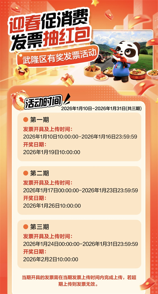 摘要: 2026年,武隆率先送上诚意大礼!“迎春促销·有奖发票”活动已于1月10日上午10点正式拉开帷幕,将持续至1月31日。在武隆旅游、购物、享美食,您手中的发票很可能变成“开年红包”,让您的消费体验超值加倍!