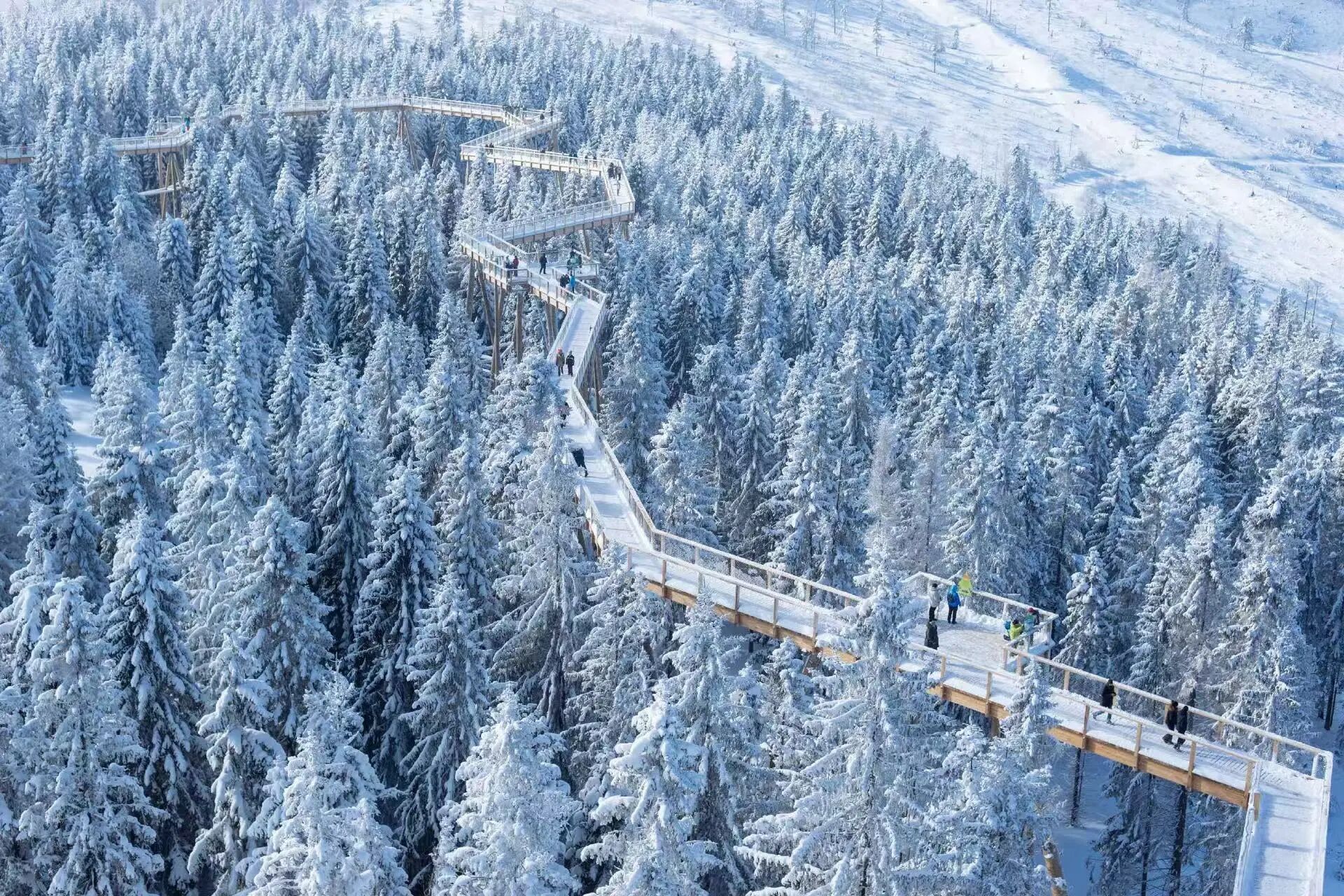 第二种浪漫,叫“林海雪原”。走进仙女山国家森林公园,雪压松枝,每一步都伴随着“咯吱”声。阳光透过挂满雪的树枝,洒下斑驳光影,随手一拍,都是可以当壁纸的画面。