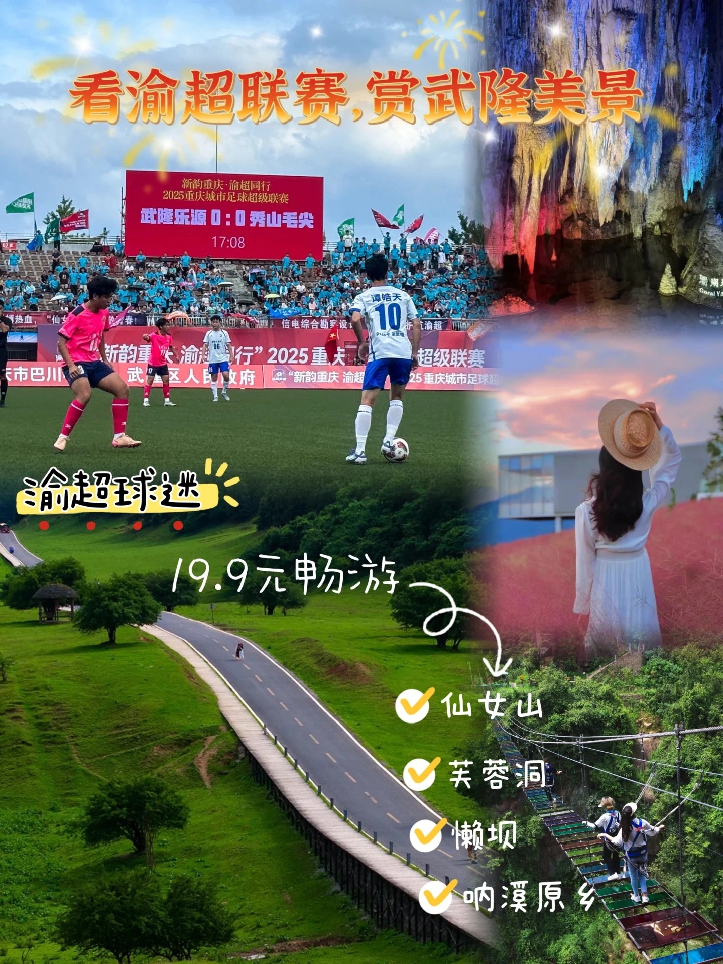 热血,不只在哨响之间;风景,永远在奔赴的路上。收下这份来自山水的邀请,在为家乡球队、也为中国足球的未来奋力呐喊之后,别忘了赴一场武隆的自然之约。让我们以足球为名,共赴一场青春、拼搏与山水诗意的浪漫相遇!