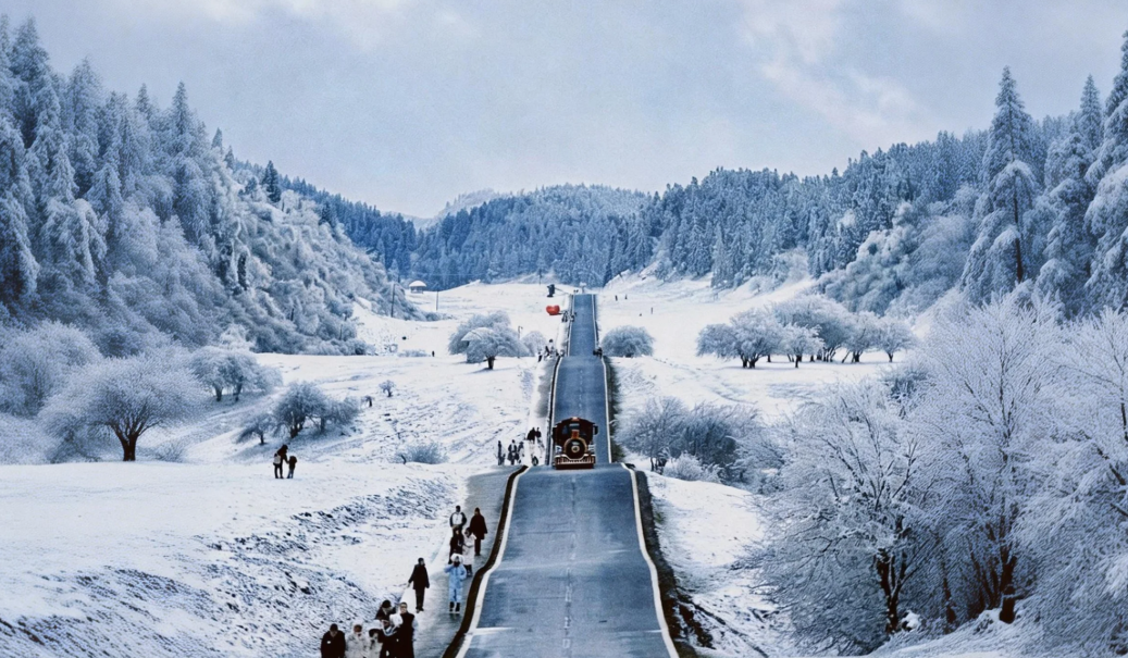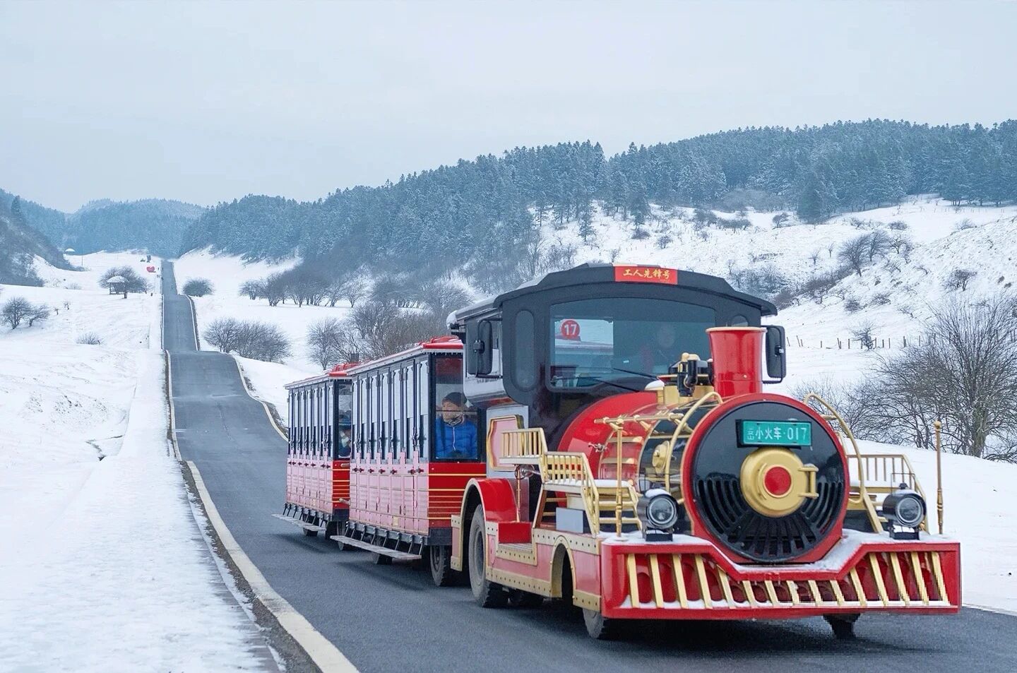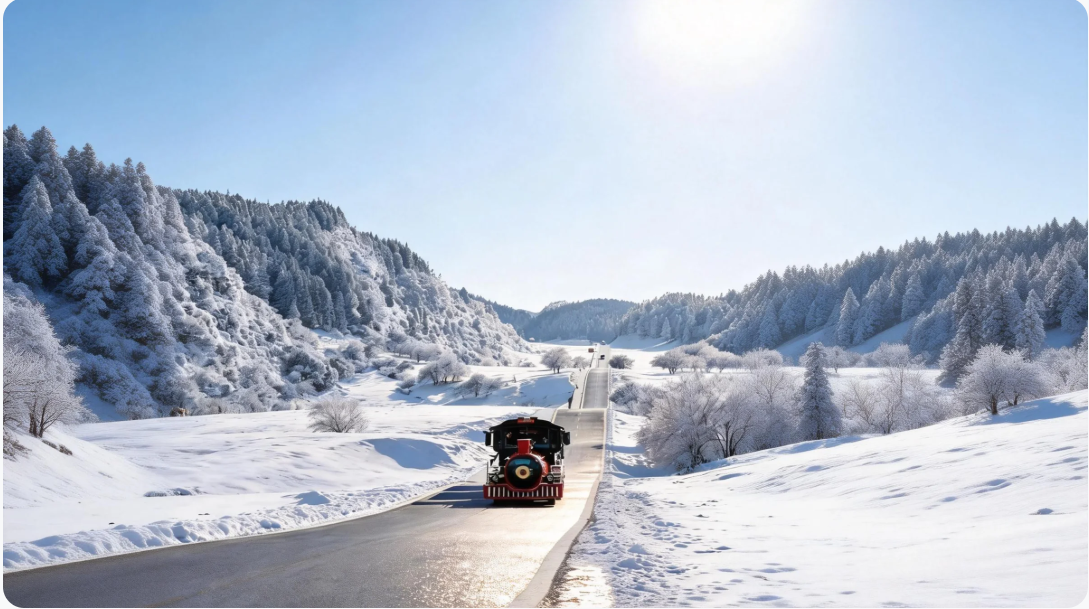 观光小火车在雪中穿梭,成为一道独特风景线