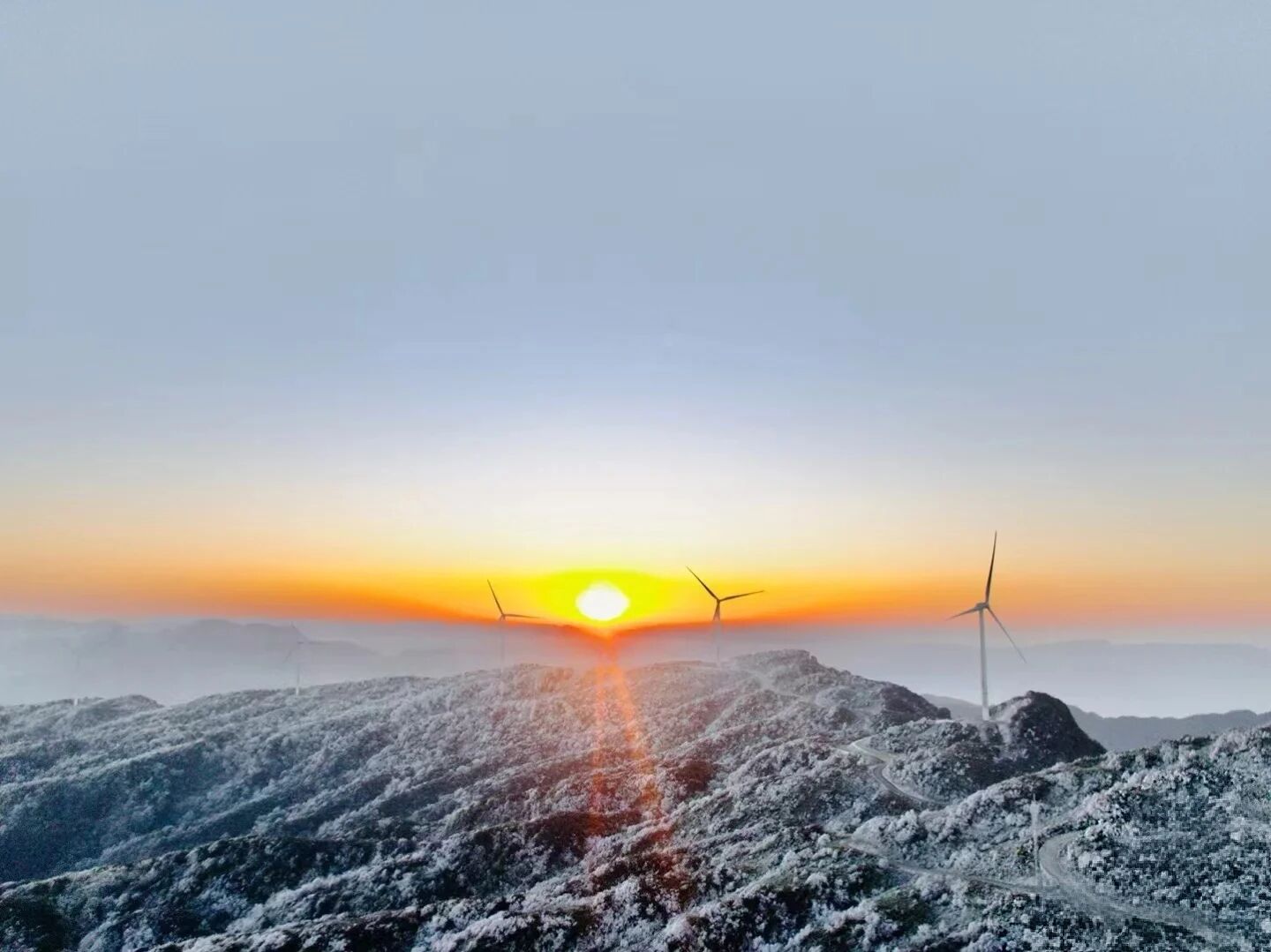 拍摄日出、云海与雪景风车共存的壮丽画面