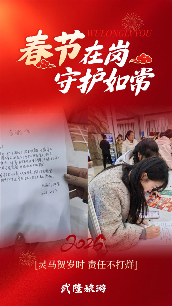 随处可见“心”服务,武隆旅游用实力“圈粉”无数。春节假期已悄然过半,抓住假期余额,逃离都市喧嚣,避开人流高峰,来武隆尽情领略这份独特的魅力与活力。