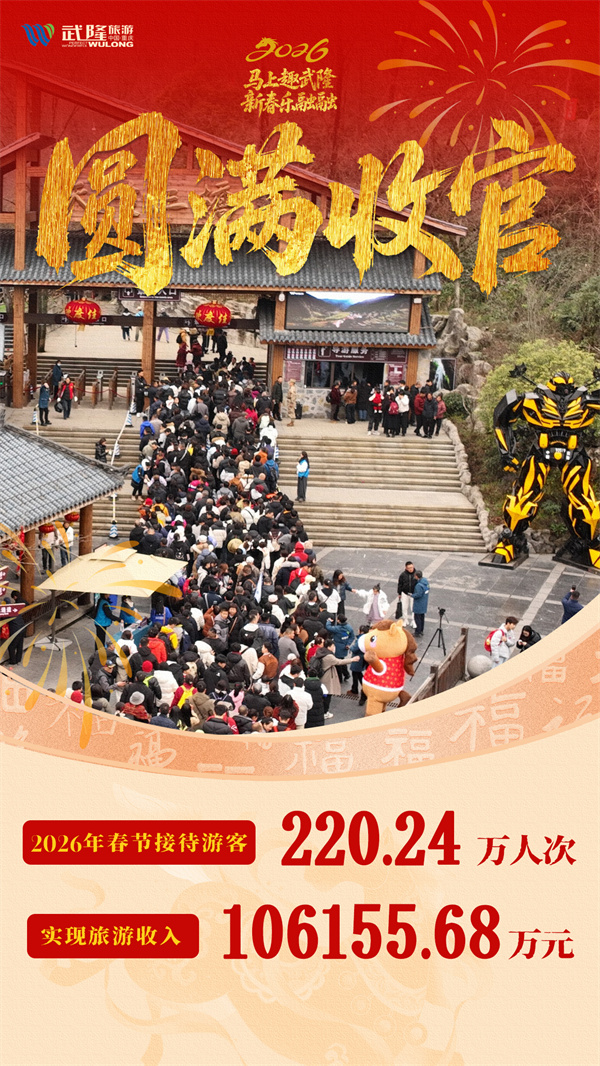 9天,216小时,在武隆把“年味儿”拉满!随着春节假期圆满落幕,武隆景区这场持续9天的“人潮盛宴”交出亮眼答卷:累计接待游客220.24万人次,实现旅游收入106155.68万元,同比增长46.21%、50.11%。来自五湖四海的游客在喀斯特风光中留下难忘记忆,也在这里加满了新一年的“热血buff”。