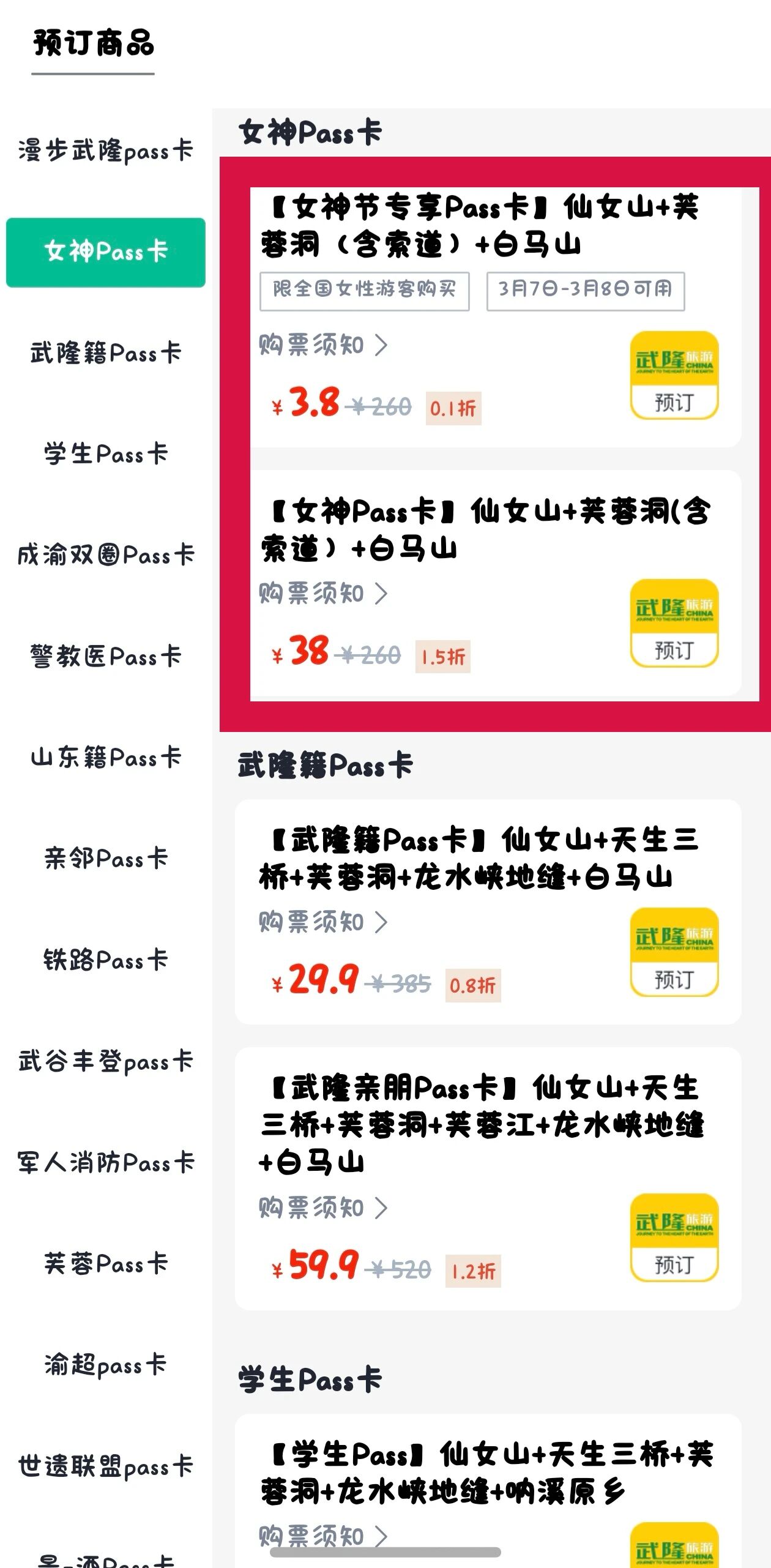 微信小程序搜索“武隆景区官方平台”,点击“女神Pass卡”专区,选择心仪产品即可快速购卡。