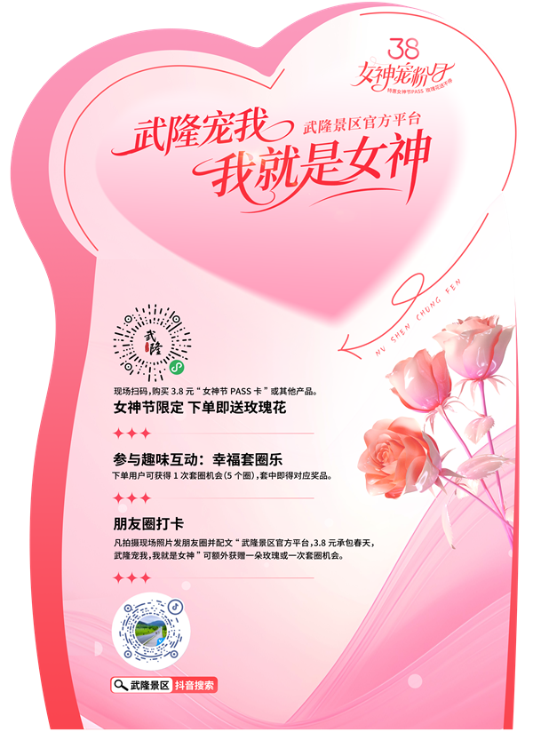 发圈打卡配文“我在武隆女神节现场,3.8元承包春天”,额外领玫瑰/套圈机会。