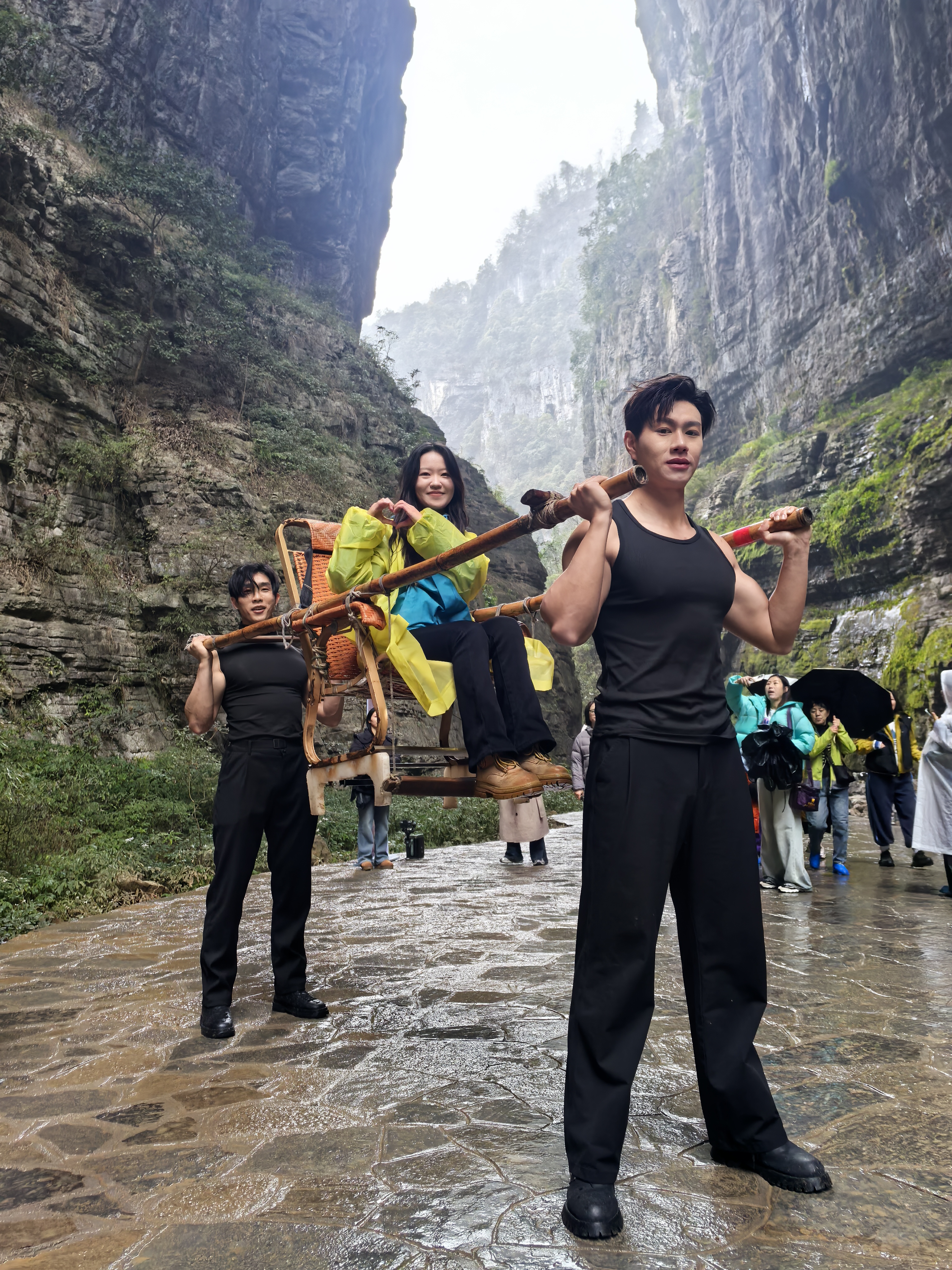 走进天生三桥,平日里雄浑的峡谷间多了一群年轻帅气的轿夫们,专门为女性游客抬滑竿,给你们专属宠爱。
